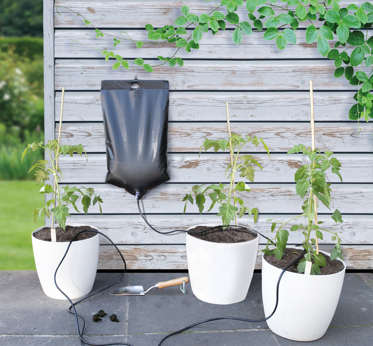 À l’usage, le système est simple : remplissez le réservoir d’eau et suspendez-le un peu plus haut à l’aide du crochet en S fourni. Disposez le tuyau goutte-à-goutte le long des plantes et placez les goutteurs aux endroits souhaités. Avec les goutteurs réglables, vous déterminez pour chaque plante la quantité d’eau délivrée. Ainsi, les semis et les plantes restent bien hydratés pendant les journées chaudes ou lorsque vous êtes absent(e) quelques jours. Le système est flexible à installer et facile à adapter aux pots, bacs ou planches de culture.