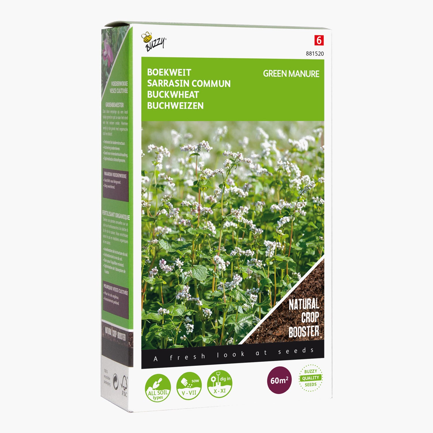 Le cycle de croissance du sarrasin commence au printemps, lorsque les graines sont semées. La plante pousse rapidement et forme un couvert végétal dense qui étouffe les mauvaises herbes. Bien que le sarrasin ne soit pas réputé pour ses fleurs spectaculaires, il produit de petites fleurs blanches qui attirent les abeilles et d’autres pollinisateurs. Le sarrasin est connu pour fleurir durant les mois d’été et peut être récolté après environ 8 à 10 semaines, selon les conditions de culture.