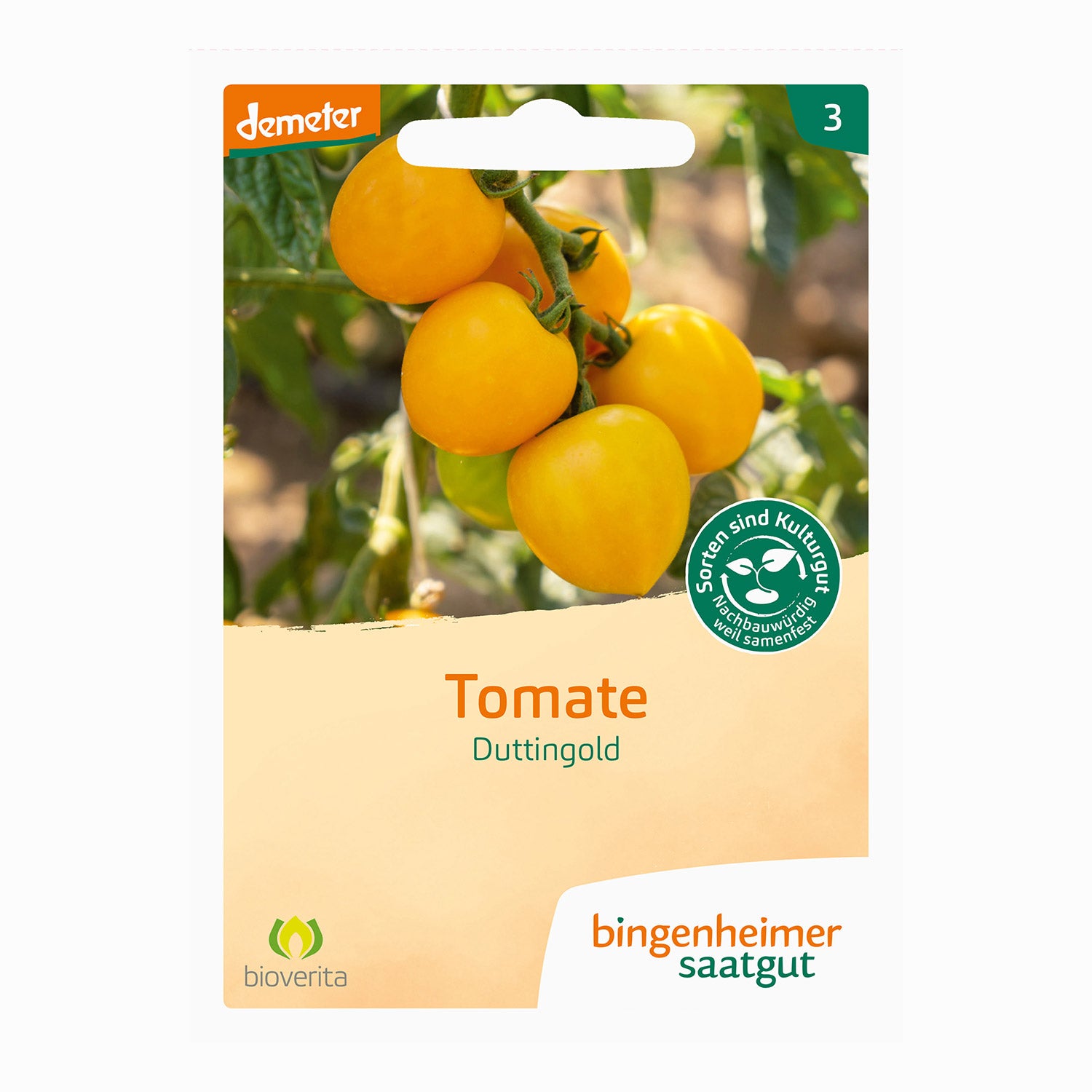 Tomate Duttingold, une tomate jaune pâle au goût agréablement aromatique et acidulé. Cette tomate à la croissance vigoureuse convient particulièrement à la culture en plein air et se caractérise par une végétation homogène avec une forte résistance au Phytophthora (Phytophthora mildiou tardif). Les fruits fermes sont remarquablement résistants à l’éclatement et, avec un fort potentiel de rendement, la Tomate Duttingold est un précieux complément pour tout jardin.