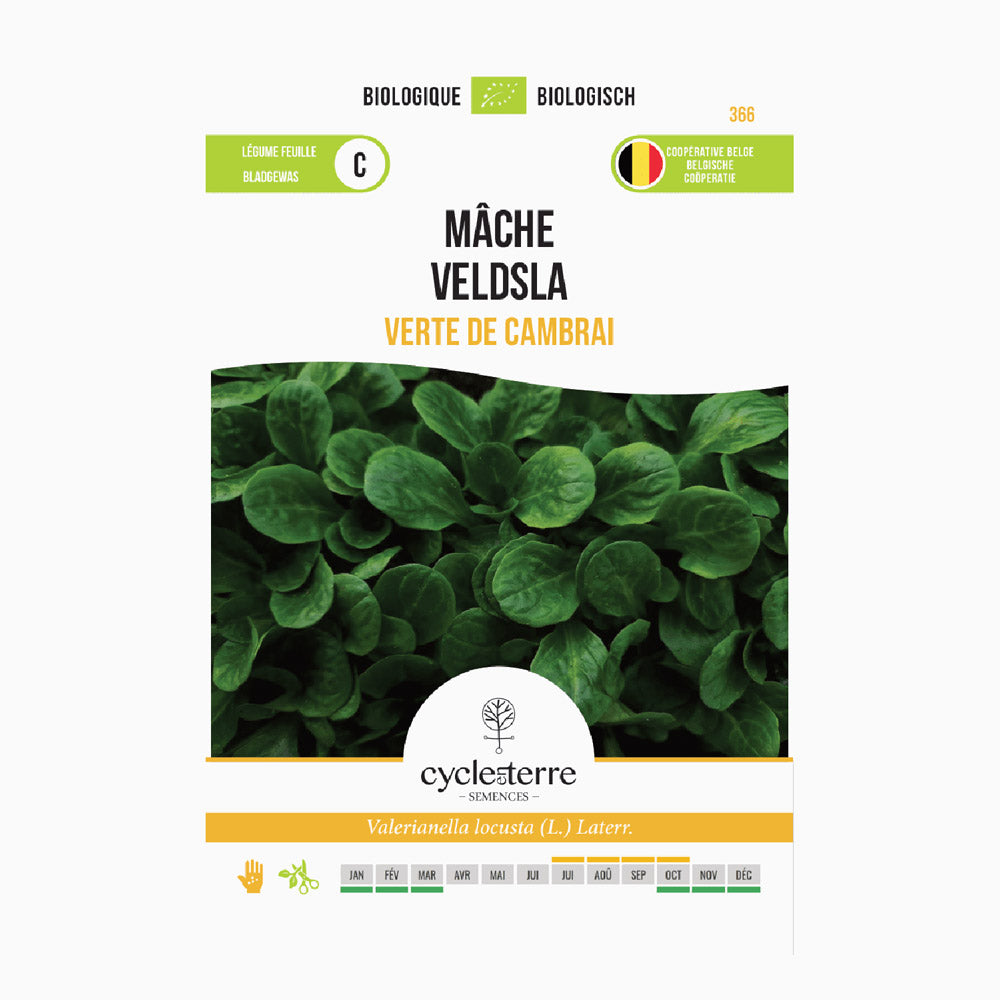 Semez la mâche de Cambrai de septembre à octobre à une profondeur de 1 cm, avec un espacement de semis de 3 x 10 cm. Cette culture résiste bien aux températures plus basses, ce qui la rend parfaite pour la saison d’automne et d’hiver. La récolte peut commencer dès 60 à 90 jours après le semis, vous permettant de profiter, pendant les mois froids, d’une récolte fraîche et verte. La mâche de Cambrai pousse très bien en pleine terre, mais peut aussi être cultivée sous serre ou sous un abri pour une protection supplémentaire contre le froid.